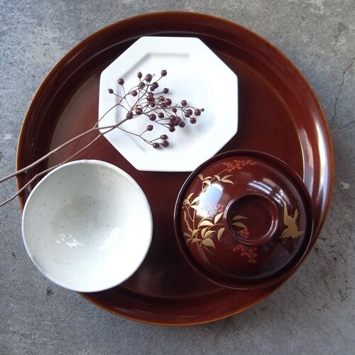 お正月を盛り上げてくれそうな、漆器の蓋付き椀です。 着物と同じ感覚で、絵付けがあるとやっぱりハレの雰囲気がグッと増します。 漆器は敷居が高いと敬遠されがちですが、今回のはお手頃なので、軽い気持ちでトライしてみてください⭐️ 栗色と呼ばれる落ち着…