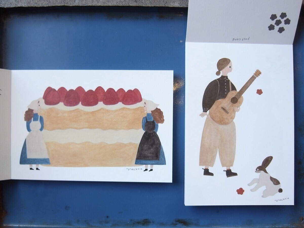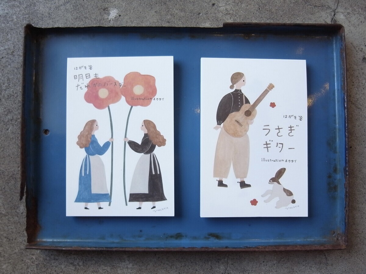 ギターの方は、はがきに描かれたモチーフが実はしりとりになっている、ユーモアたっぷりのデザインなんです。